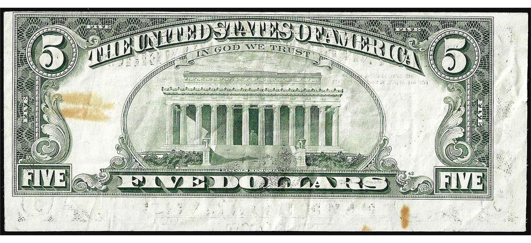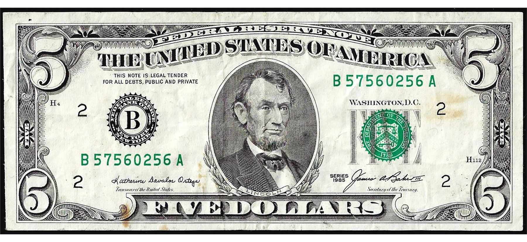 One 1985 $5 Federal Reserve Note Misaligned Printing Error.