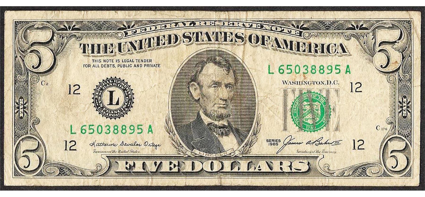 One 1985 $5 Federal Reserve Partial Offset ERROR Note.