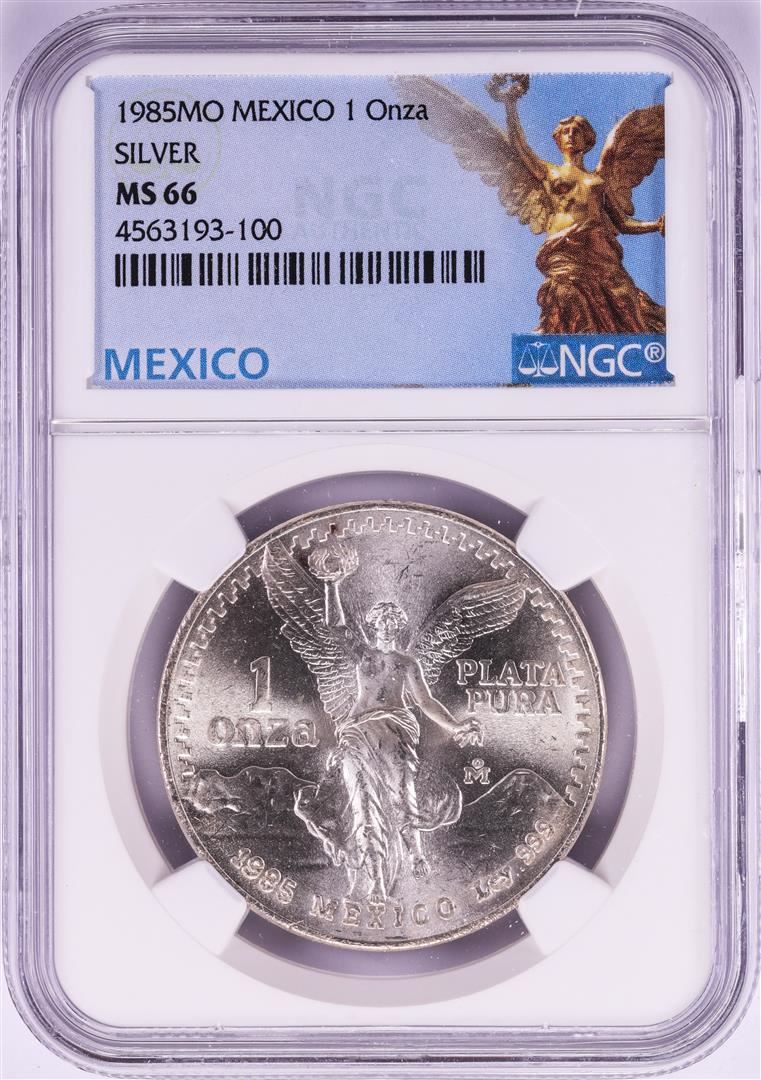 One 1985Mo Mexico 1 Onza Libertad Silver Coin NGC MS66. NGC Certified.