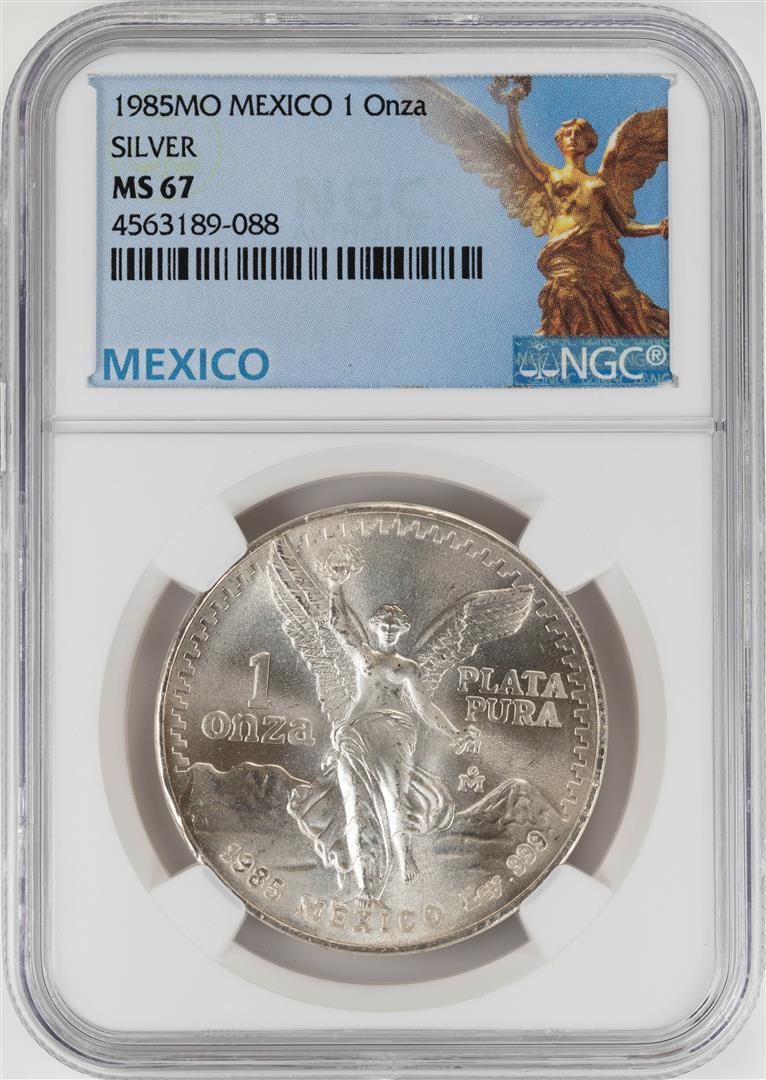 One 1985Mo Mexico 1 Onza Libertad Silver Coin NGC MS67. NGC Certified.