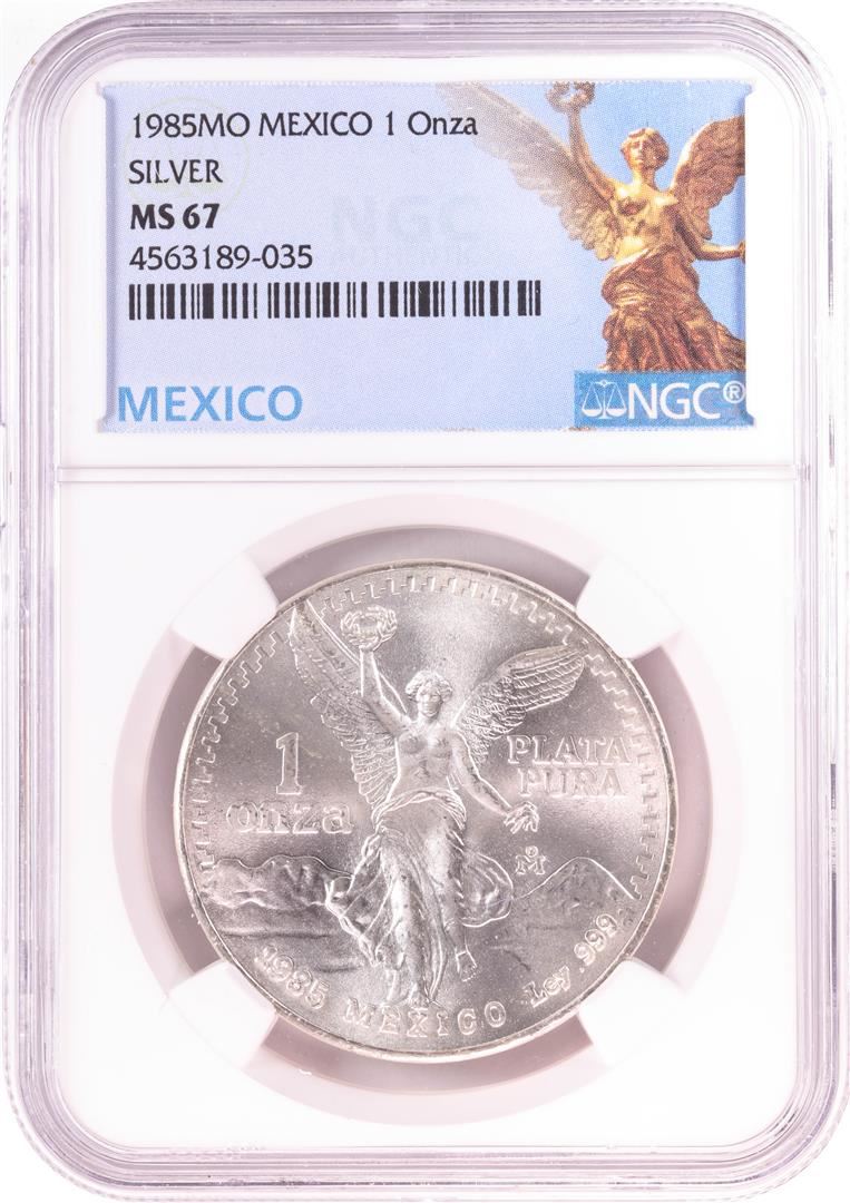 One 1985Mo Mexico 1 Onza Libertad Silver Coin NGC MS67. NGC Certified.