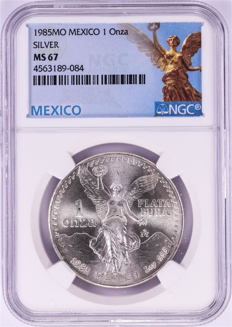 One 1985Mo Mexico 1 Onza Libertad Silver Coin NGC MS67. NGC Certified.