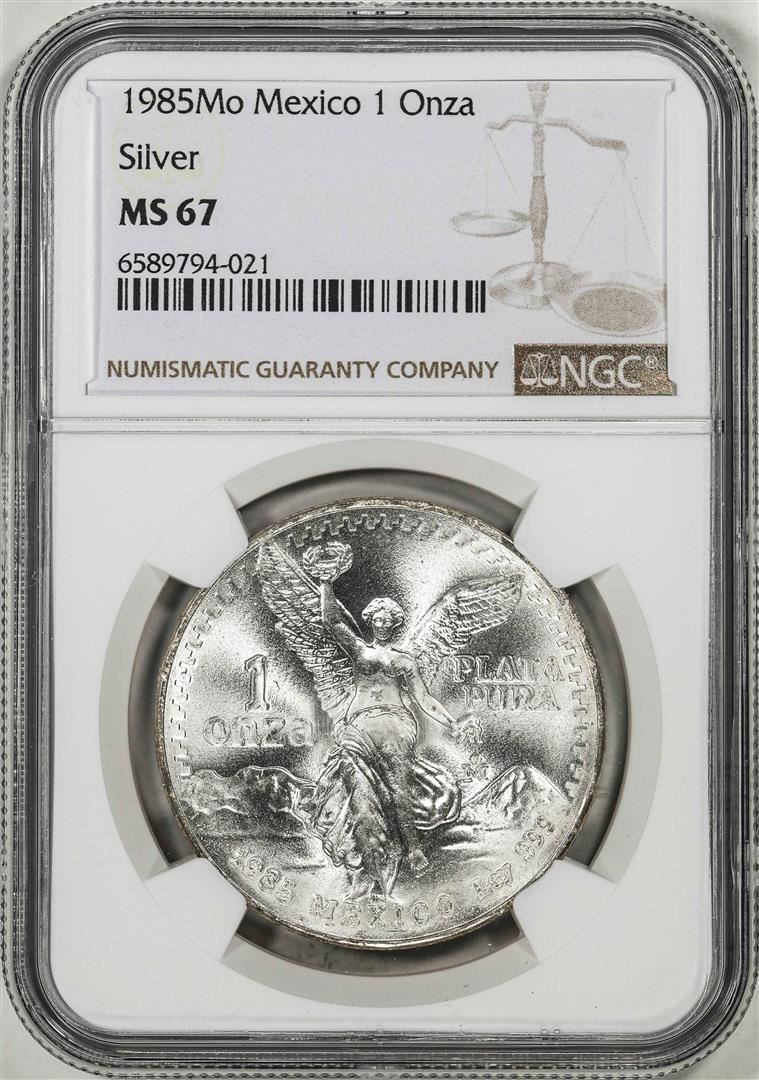One 1985Mo Mexico 1 Onza Libertad Silver Coin NGC MS67. NGC Certified.