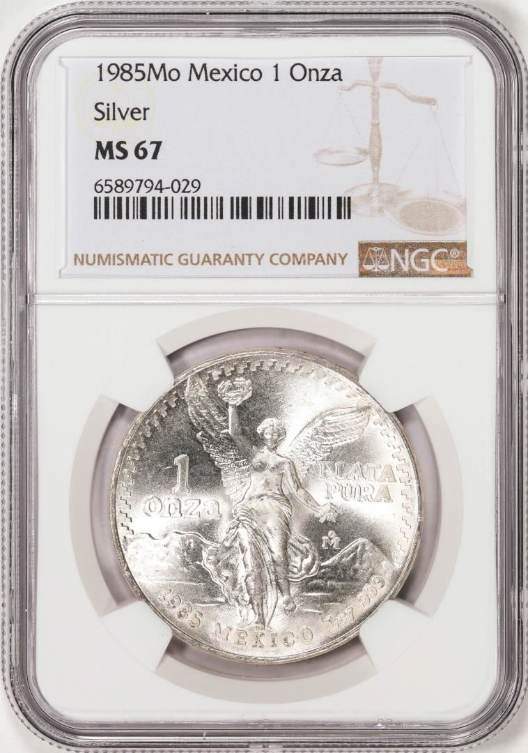 One 1985Mo Mexico 1 Onza Libertad Silver Coin NGC MS67. NGC Certified.