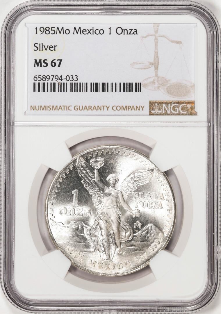 One 1985Mo Mexico 1 Onza Libertad Silver Coin NGC MS67. NGC Certified.