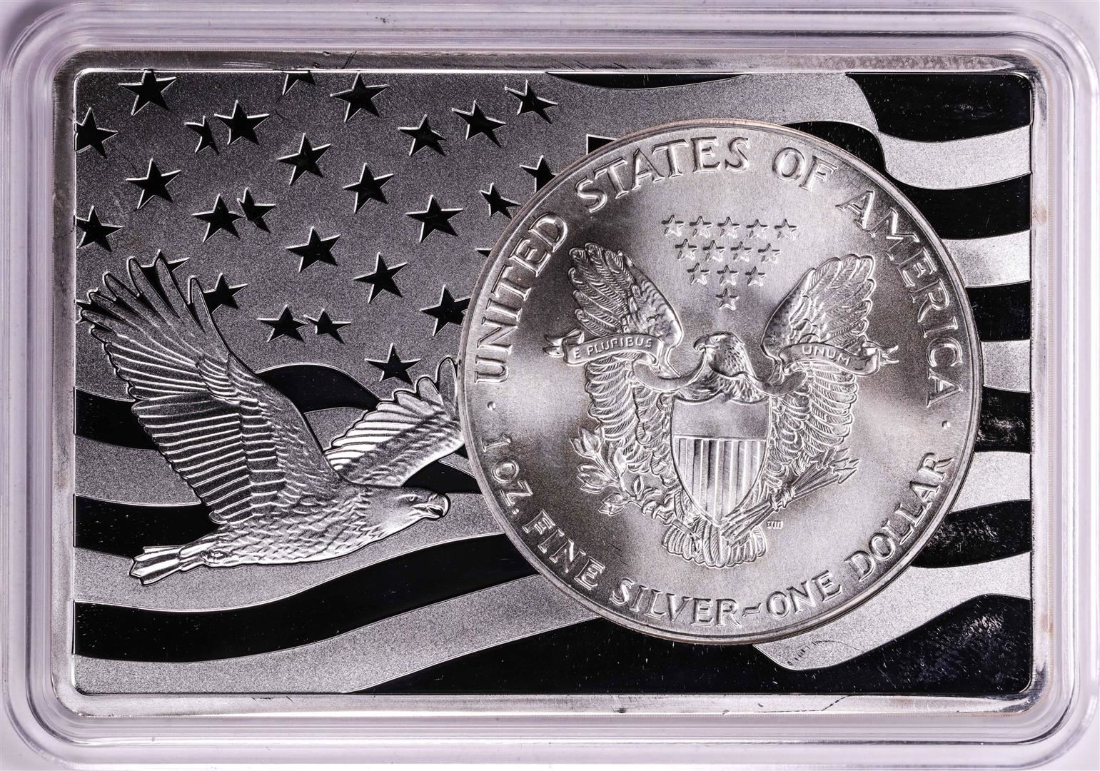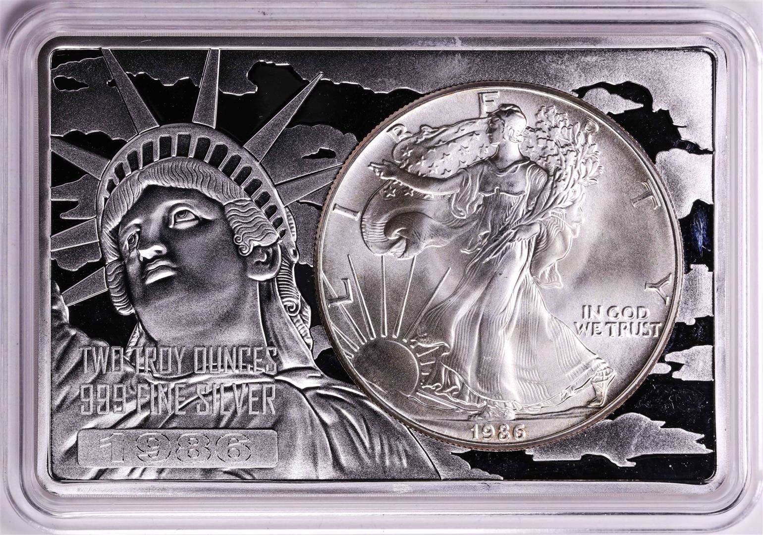 One 1986 $1 American Silver Eagle Coin & 2oz Silver Bar Set.