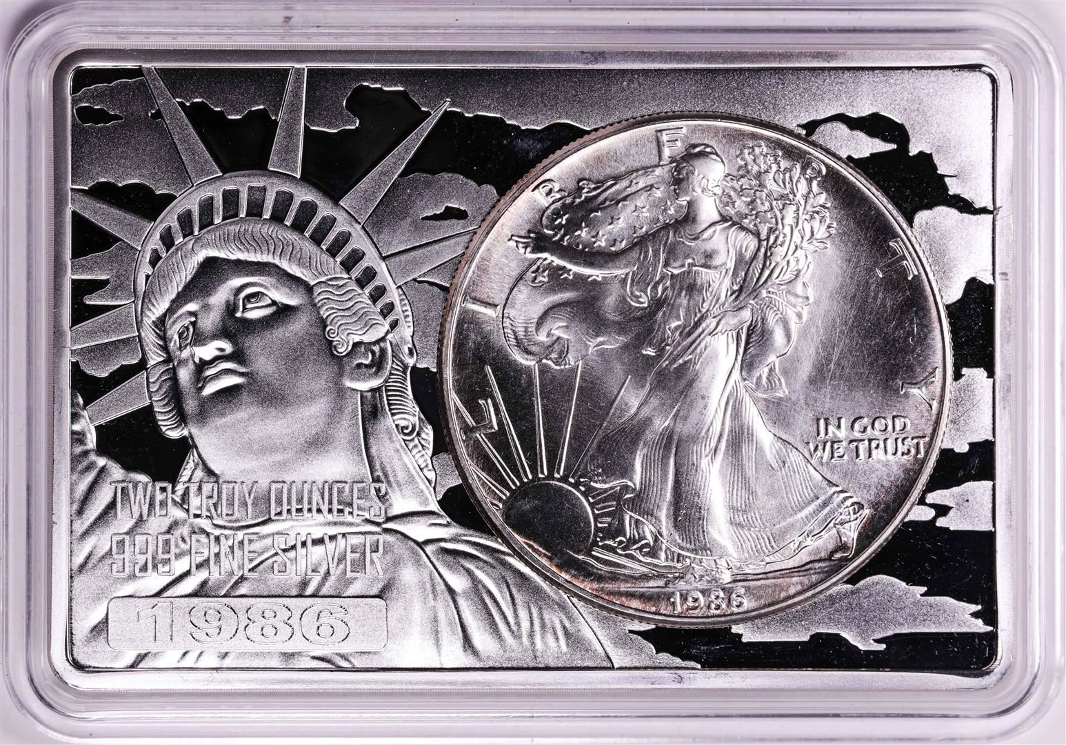 One 1986 $1 American Silver Eagle Coin & 2oz Silver Bar Set.