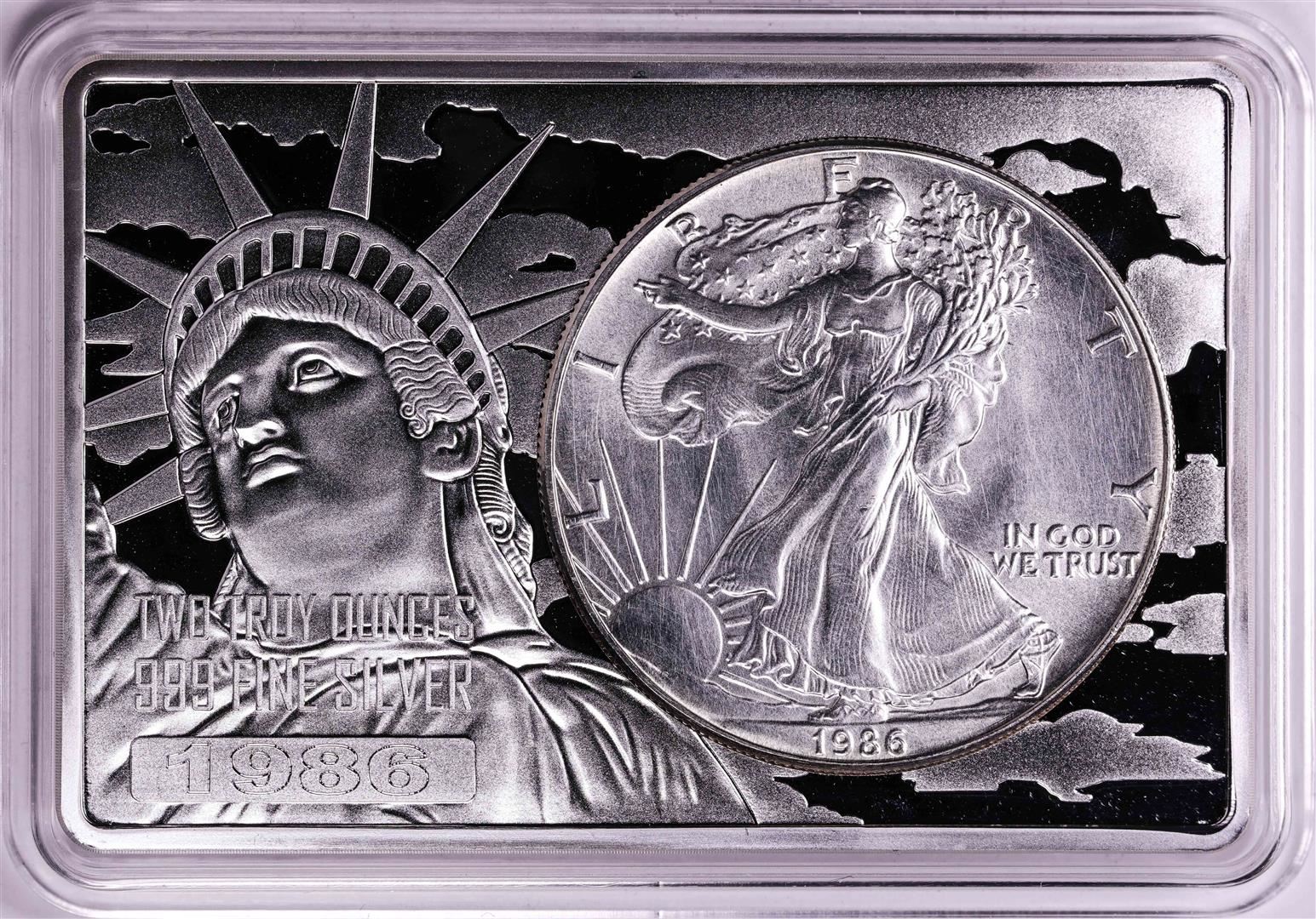 One 1986 $1 American Silver Eagle Coin & 2oz Silver Bar Set.