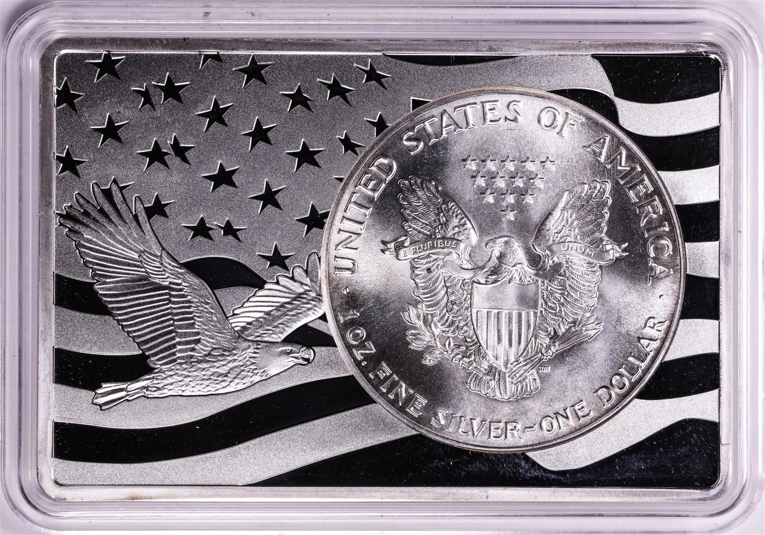 One 1986 $1 American Silver Eagle Coin & 2oz Silver Bar Set.