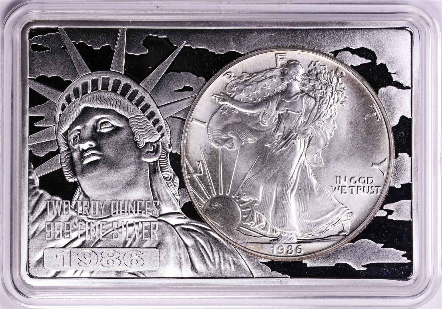 One 1986 $1 American Silver Eagle Coin & 2oz Silver Bar Set.