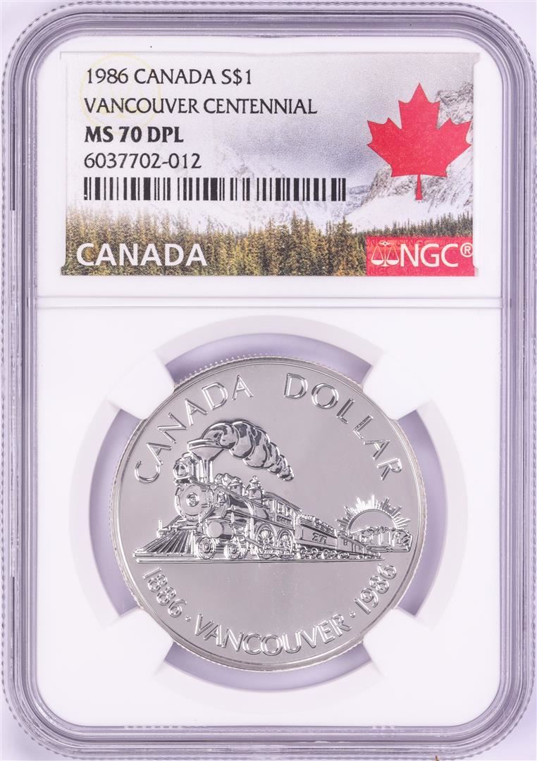 One 1986 $1 Canada Vancouver Centennial Silver Dollar Coin NGC MS70 DPL. NGC Certified.