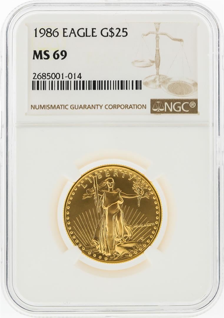 One 1986 $25 American Gold Eagle Coin NGC Graded MS69. NGC Certified.