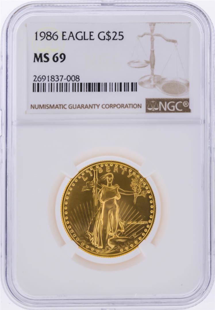 One 1986 $25 American Gold Eagle Coin NGC Graded MS69. NGC Certified.