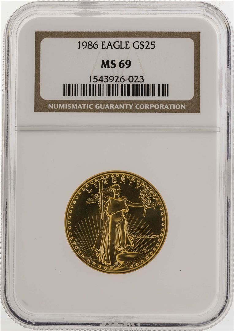 One 1986 $25 American Gold Eagle Coin NGC MS69. NGC Certified.