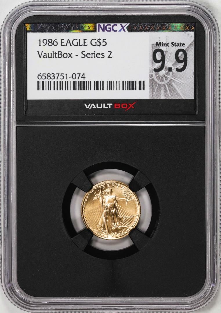 One 1986 $5 American Gold Eagle Coin NGCX Mint State 9.9 VaultBox Series 2. NGC Certified.