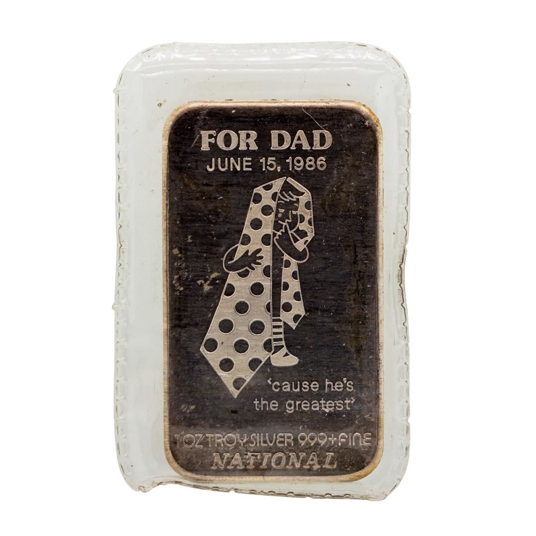 One 1986 Canada National For Dad 1 oz .999 Fine Silver Art Bar.