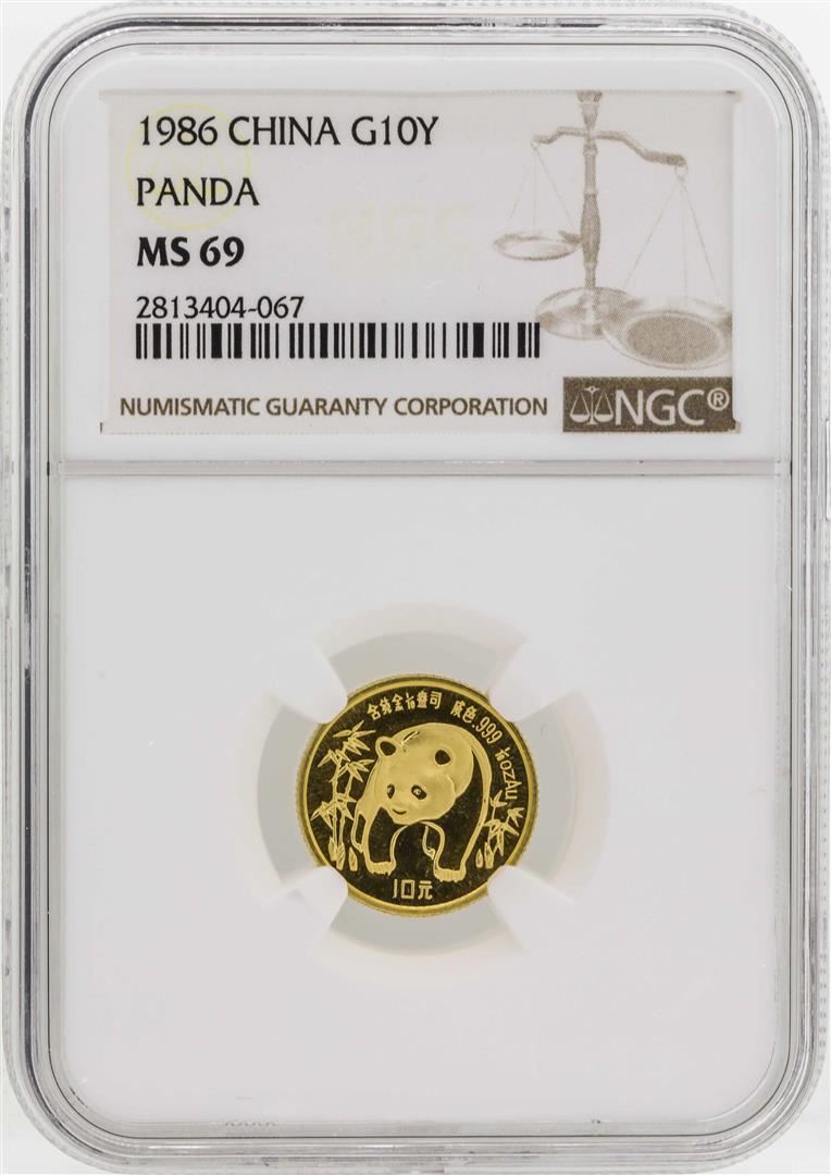 One 1986 China 1/10 oz. Panda 10 Yuan Gold Coin NGC MS69. NGC Certified.