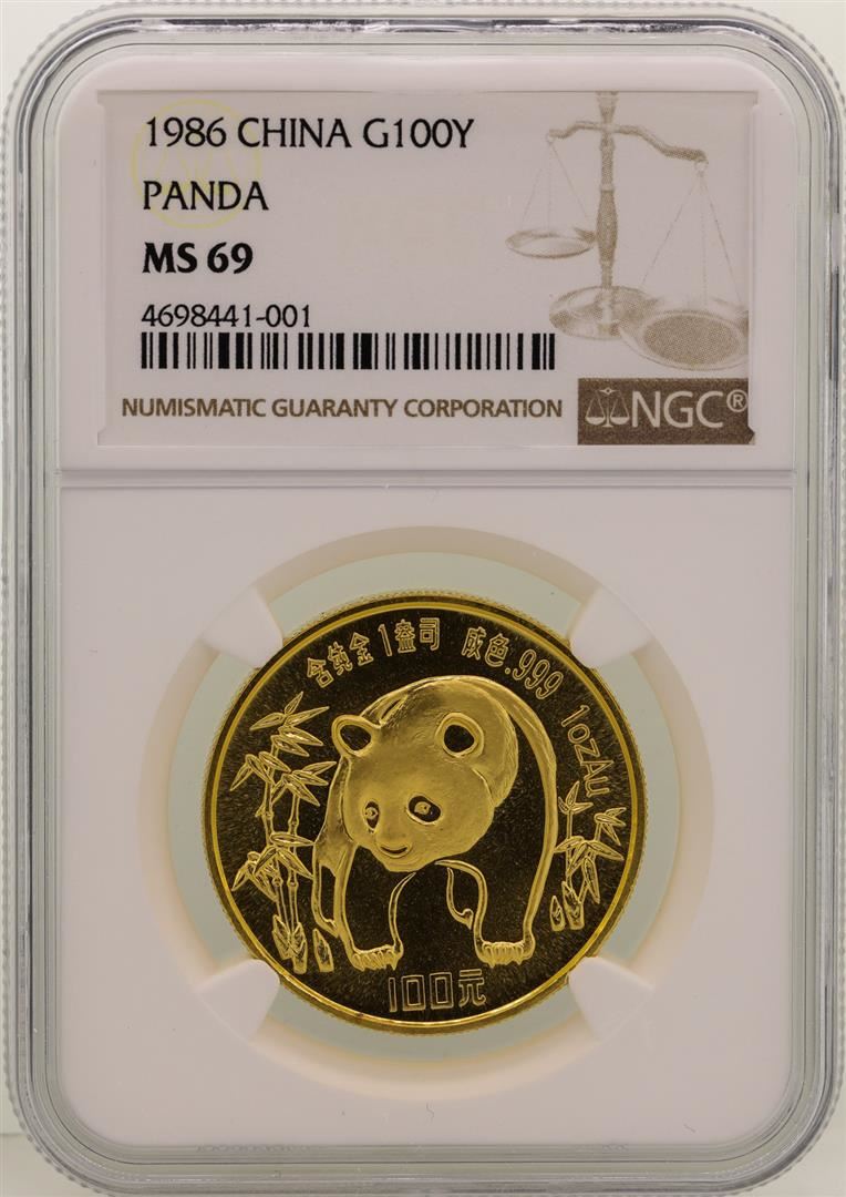 One 1986 China 100 Yuan Gold Panda Coin NGC MS69. NGC Certified.