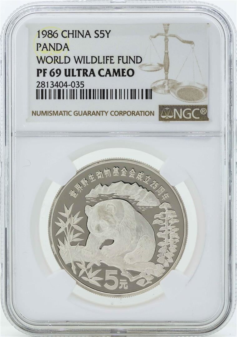 1986 China 5 Yuan Panda Silver Coin World Wildlife Fund NGC PF69 Ultra Cameo