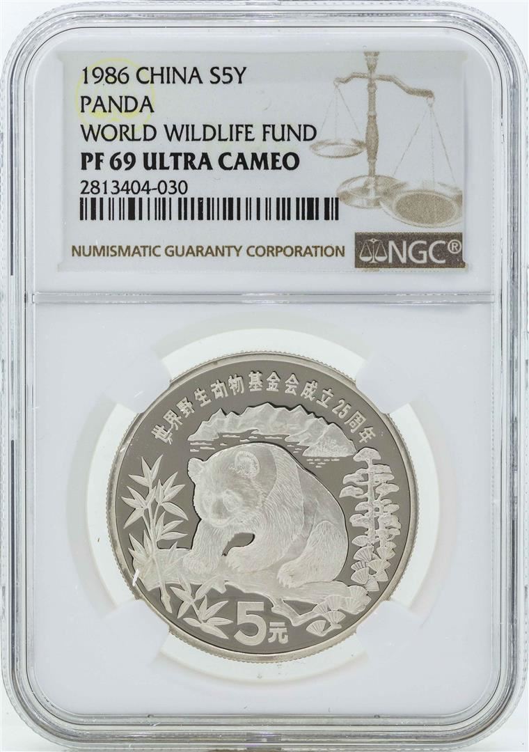 1986 China 5 Yuan Panda Silver Coin World Wildlife Fund NGC PF69 Ultra Cameo