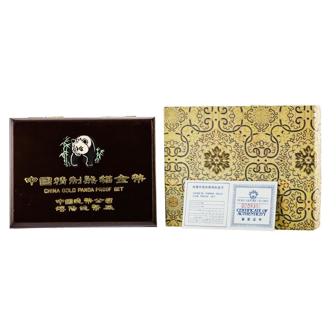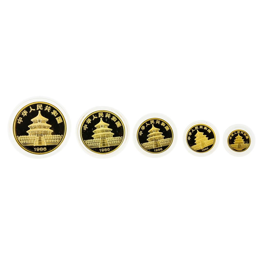 One 1986 China Panda Gold Coin Proof Set. Included in this set there are (1) 100 Yuan, (1) 50 Yuan, (1) 25 Yuan, (1) 10 Yuan, and (1) 5 Yuan gold coin.
