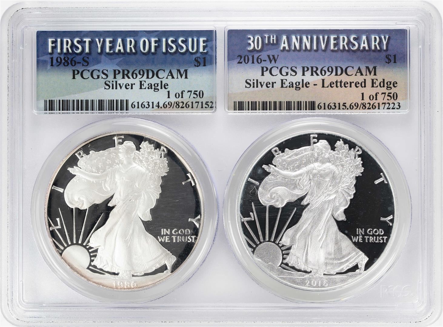 1986-S & 2016-W $1 Proof American Silver Eagle Coin Set PCGS PR69DCAM
