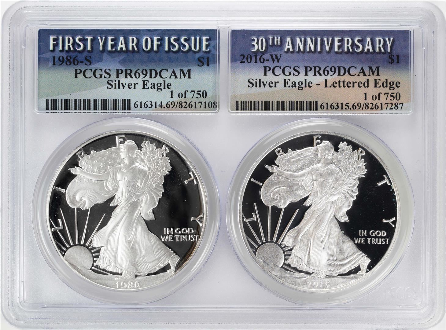 1986-S & 2016-W $1 Proof American Silver Eagle Coin Set PCGS PR69DCAM