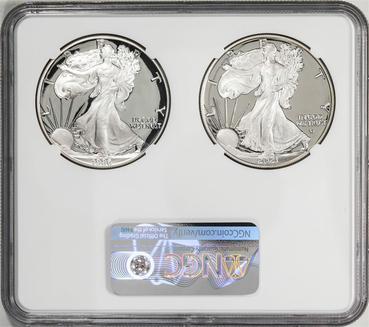 One 1986-S & 2021-S First Year of Issue $1 Proof Silver Eagle Coin Set NGC PF69 Ultra Cameo. NGC Certified.