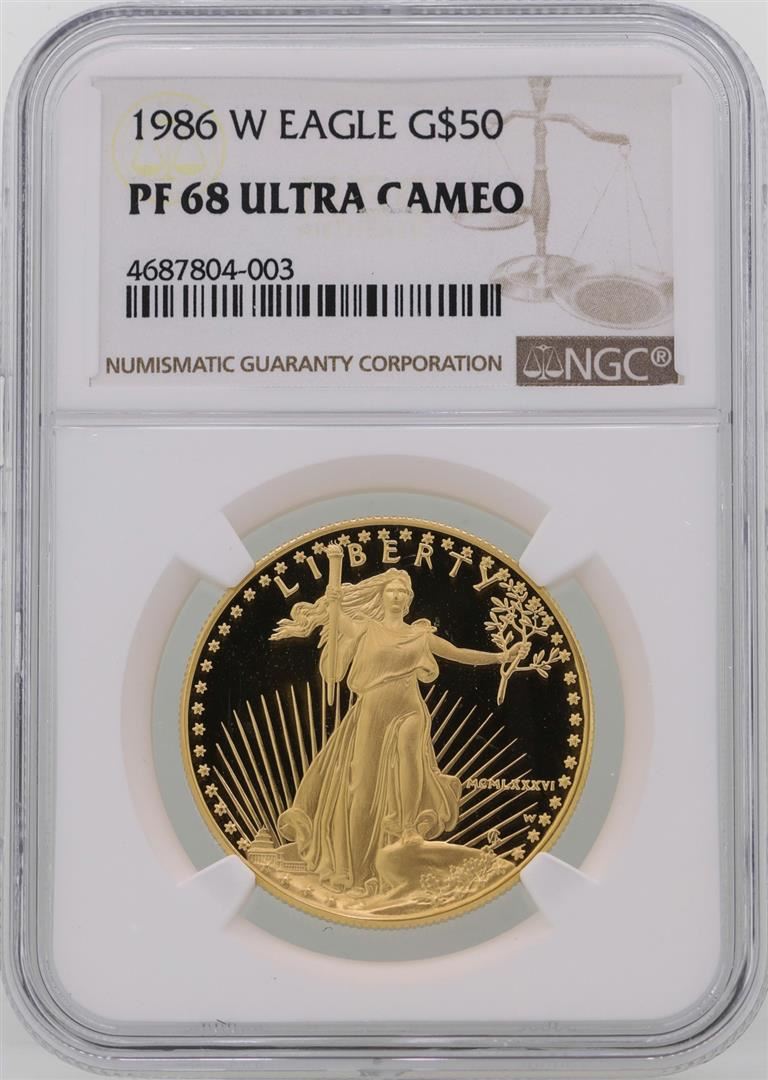 One 1986-W $50 American Gold Eagle Coin NGC PF68 Ultra Cameo. NGC Certified.