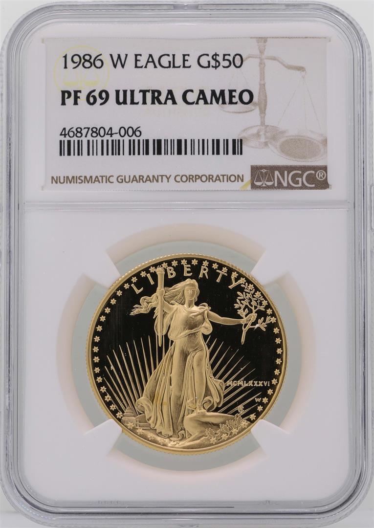 One 1986-W $50 American Gold Eagle Coin NGC PF69 Ultra Cameo. NGC Certified.