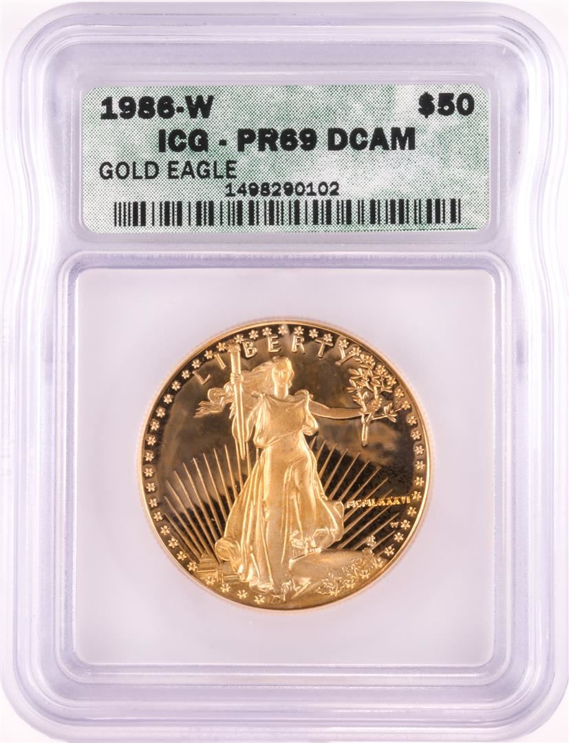 One 1986-W Proof $50 American Gold Eagle Gold Coin ICG PR69DCAM. ICG Certified.