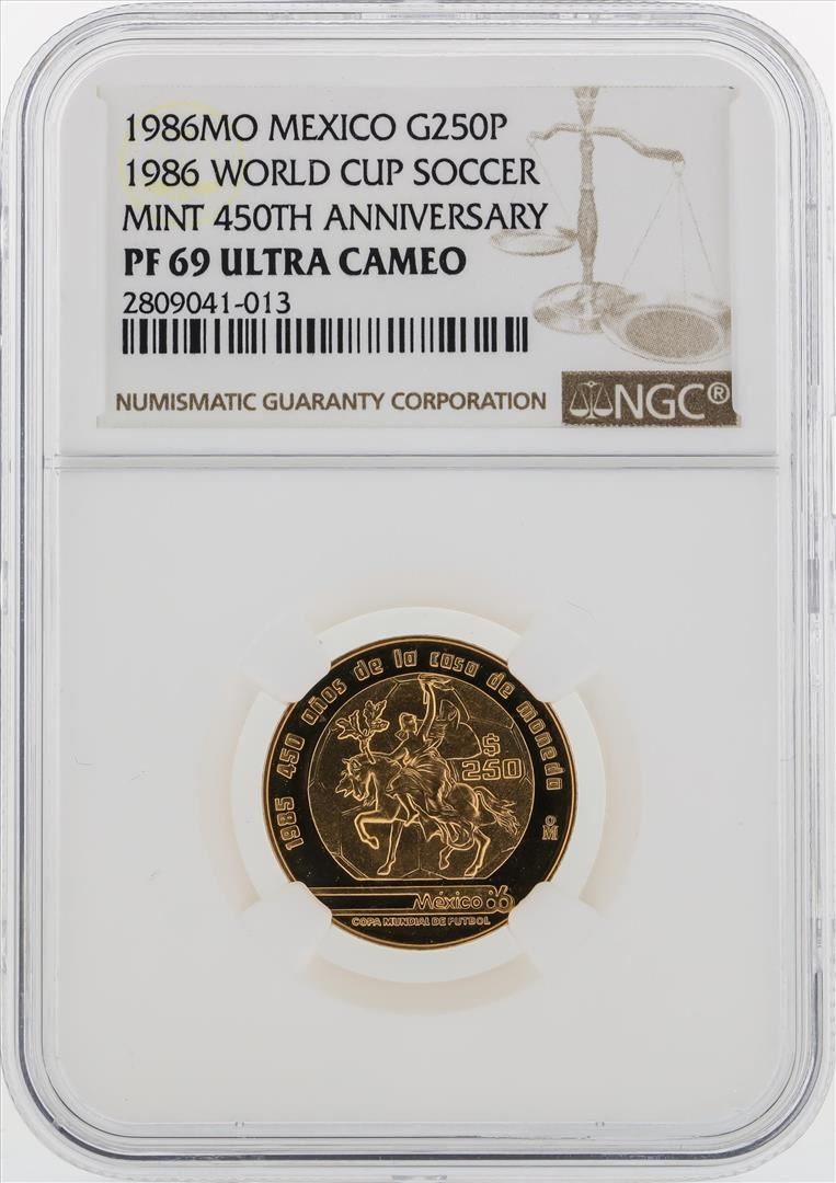 One 1986MO Mexico $250 Peso World Cup Soccor Gold Coin NGC PF69. NGC Certified.