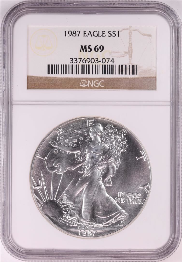 One 1987 $1 American Silver Eagle Coin NGC MS69. NGC Certified.