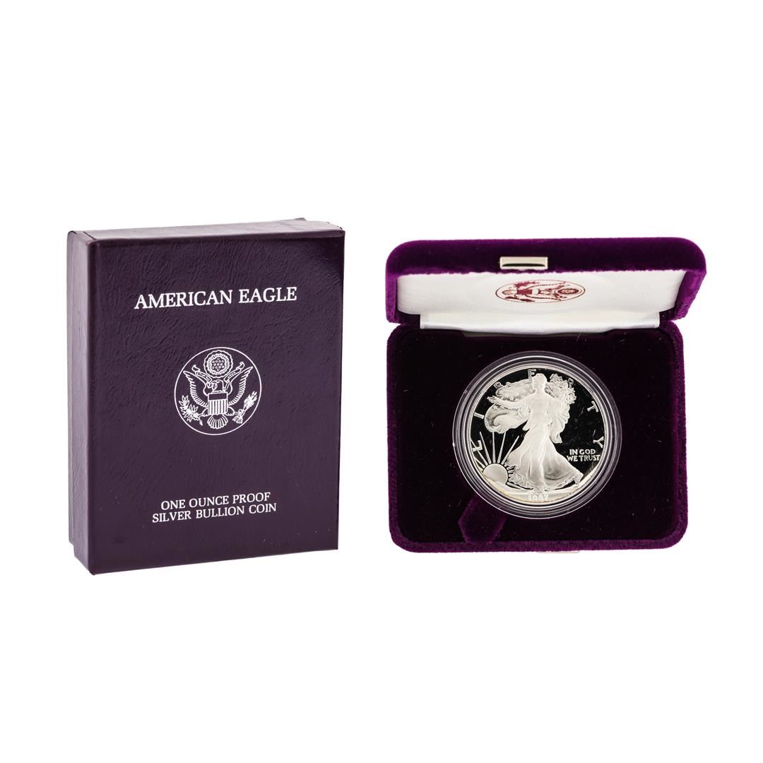 One 1987 1oz American Silver Eagle Proof Coin with Box.