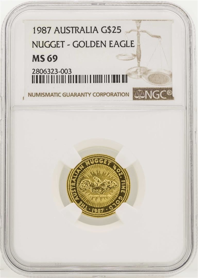 One 1987 Australia $25 Nugget Golden Eagle Gold Coin NGC MS69. NGC Certified.