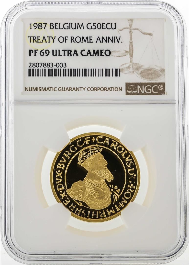 One 1987 Belgium 50 ECU Treaty of Rome Anniversary Gold Coin NGC PF69 Ultra Cameo. NGC Certified.