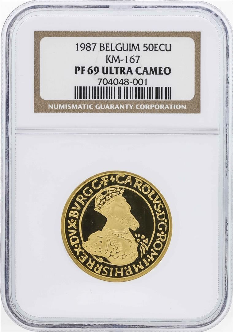 One 1987 Belgium 50 Ecu 1/2 Oz. Gold Coin NGC PF69 Ultra Cameo. NGC Certified.