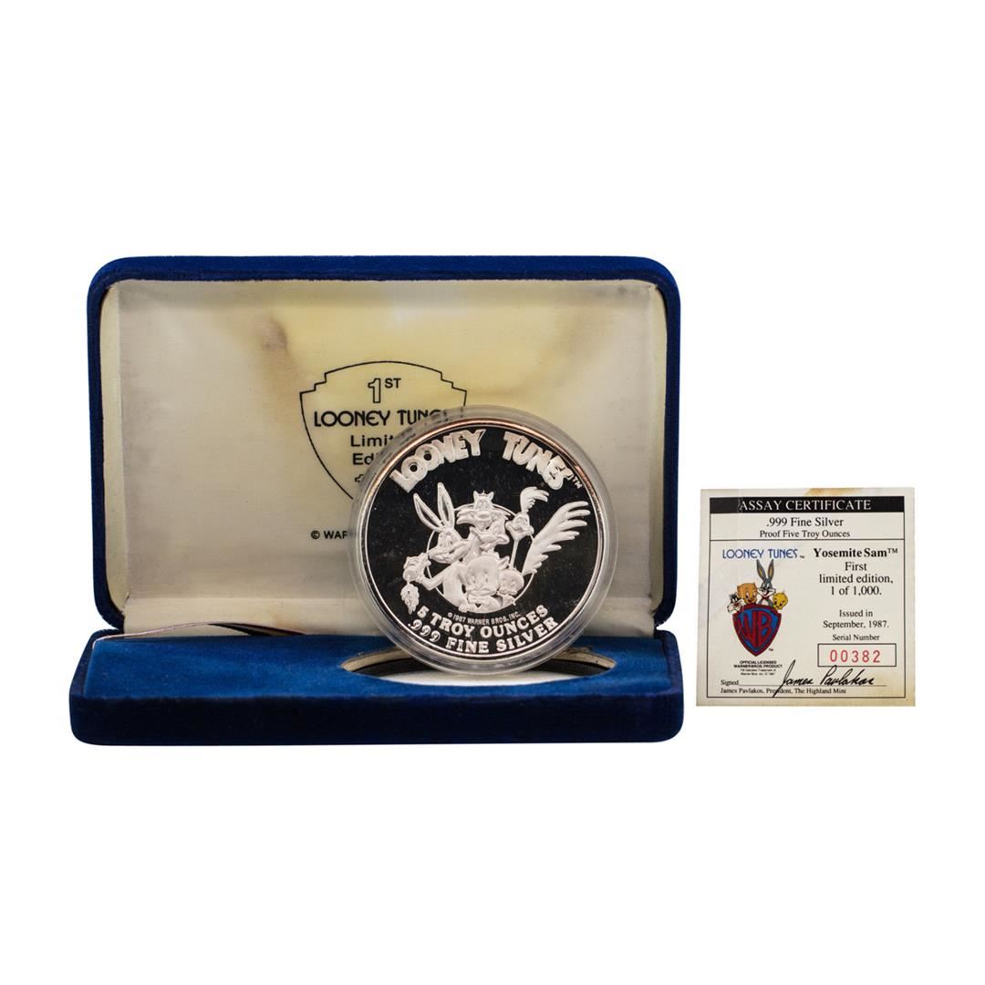 One 1987 Looney Tunes Yosemite Sam 5oz .999 Silver Coin w/Box & COA Limited Edition.