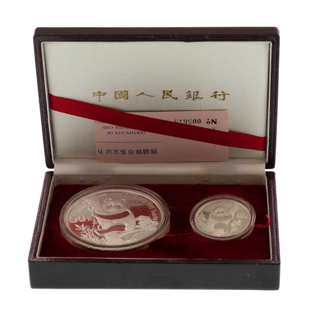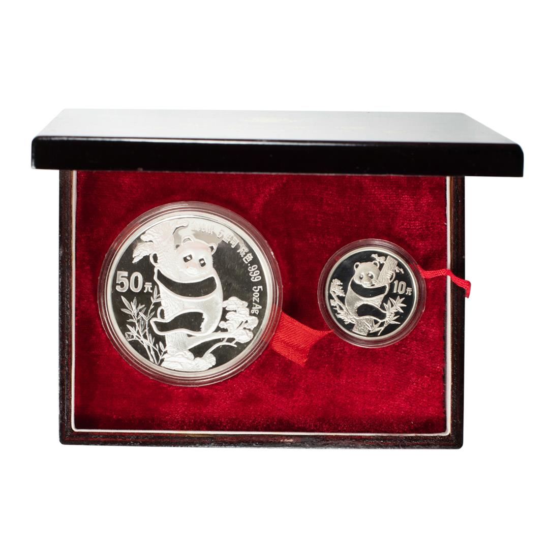 One 1987 People's Republic China Silver 2-Piece Proof Panda Set. A choice 10 (1 oz) and 50 (5 oz) yuan set, housed in the original box of issue with COA.