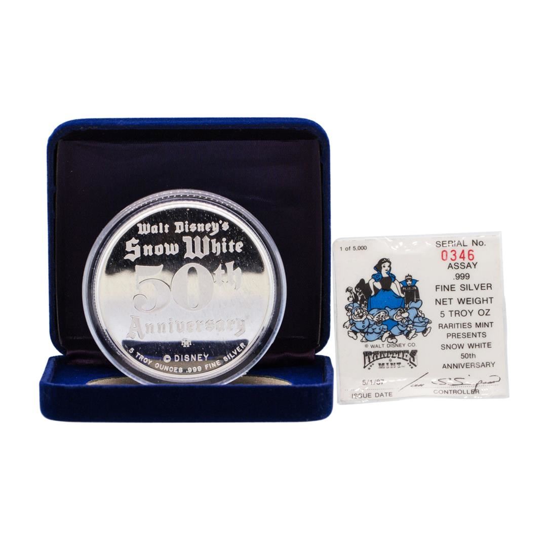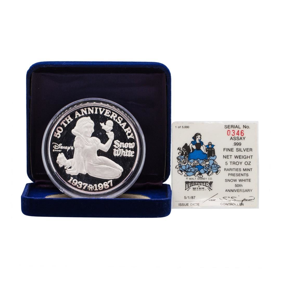 One 1987 Rarities Mint Walt Disney Snow White 50th 5 oz .999 Silver Coin w/Box & COA.