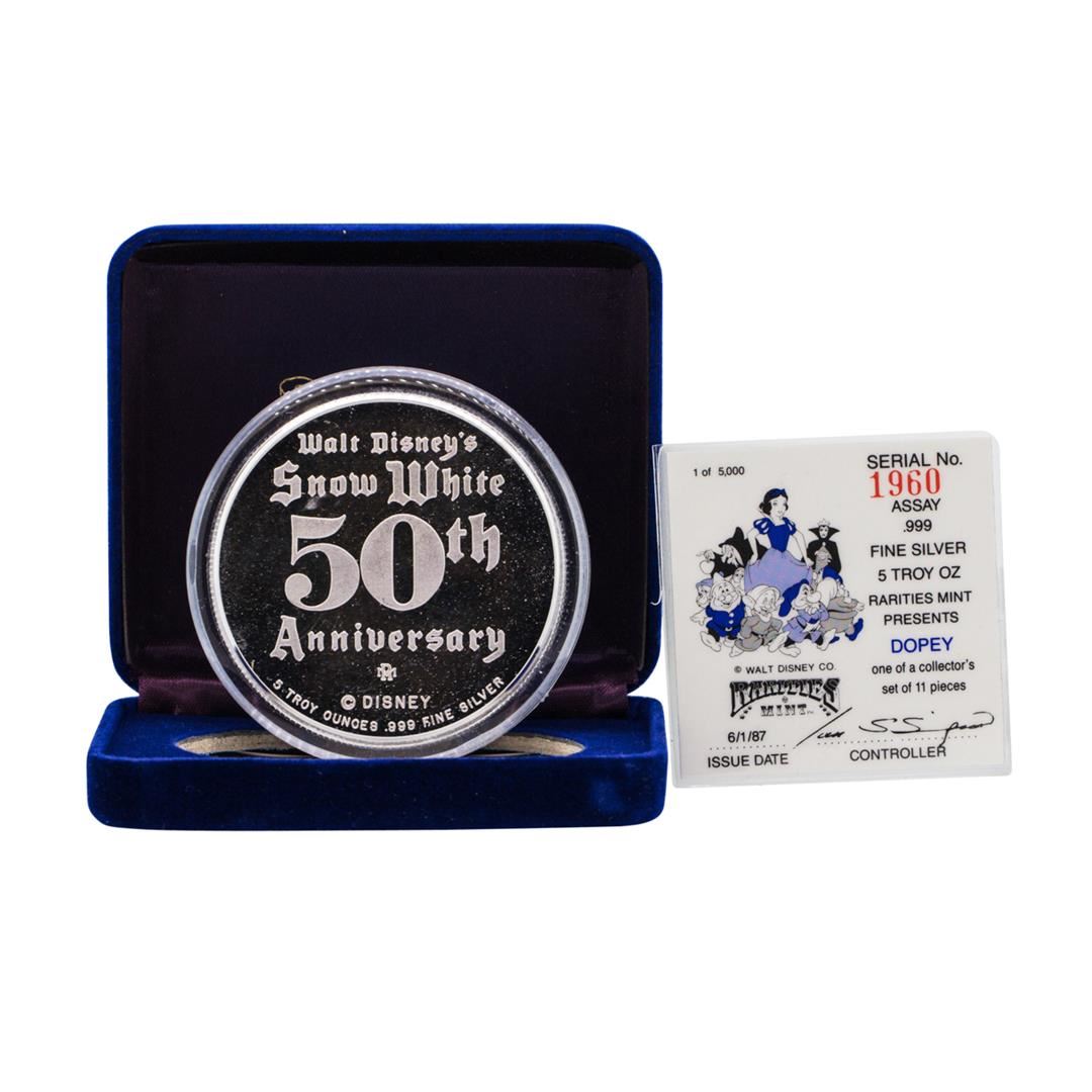 One 1987 Rarities Mint Walt Disney Snow White Dopey 5 oz .999 Silver Coin w/Box & COA.
