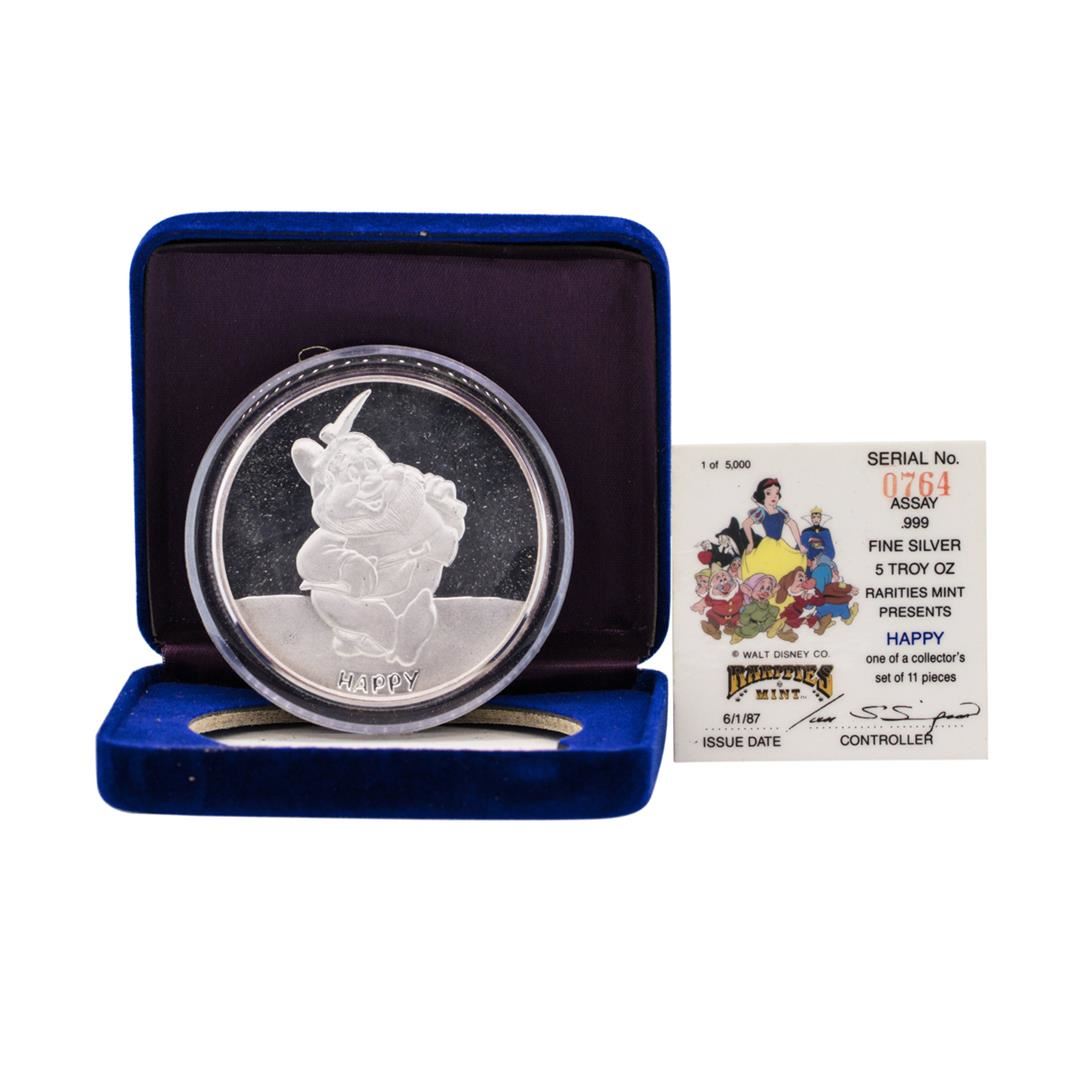 One 1987 Rarities Mint Walt Disney Snow White Happy 5 oz .999 Silver Coin w/Box & COA.