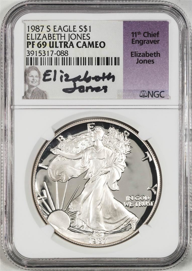 One 1987-S $1 Proof American Silver Eagle Coin NGC PF69 Ultra Cameo Elizabeth Jones Signature. NGC Certified.