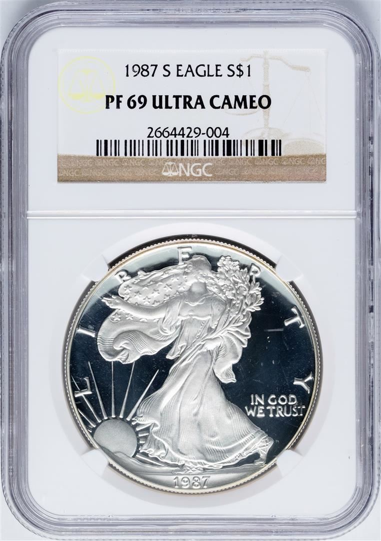 One 1987-S $1 Proof American Silver Eagle Coin NGC PF69 Ultra Cameo. NGC Certified.