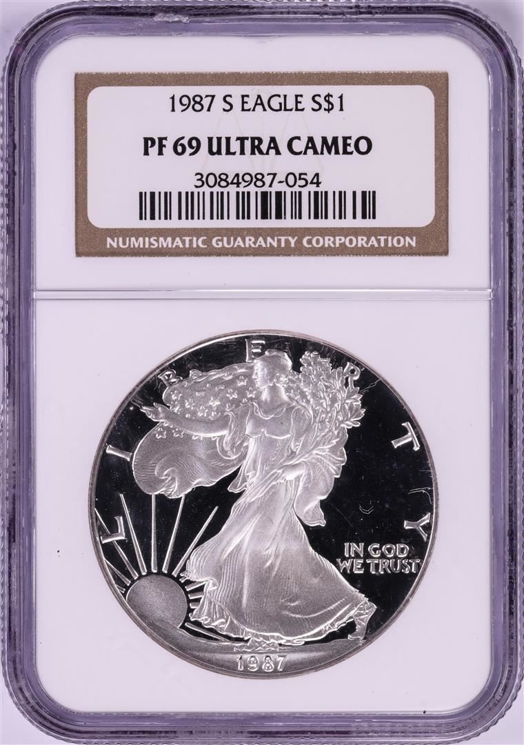 One 1987-S $1 Proof American Silver Eagle Coin NGC PF69 Ultra Cameo. NGC Certified.