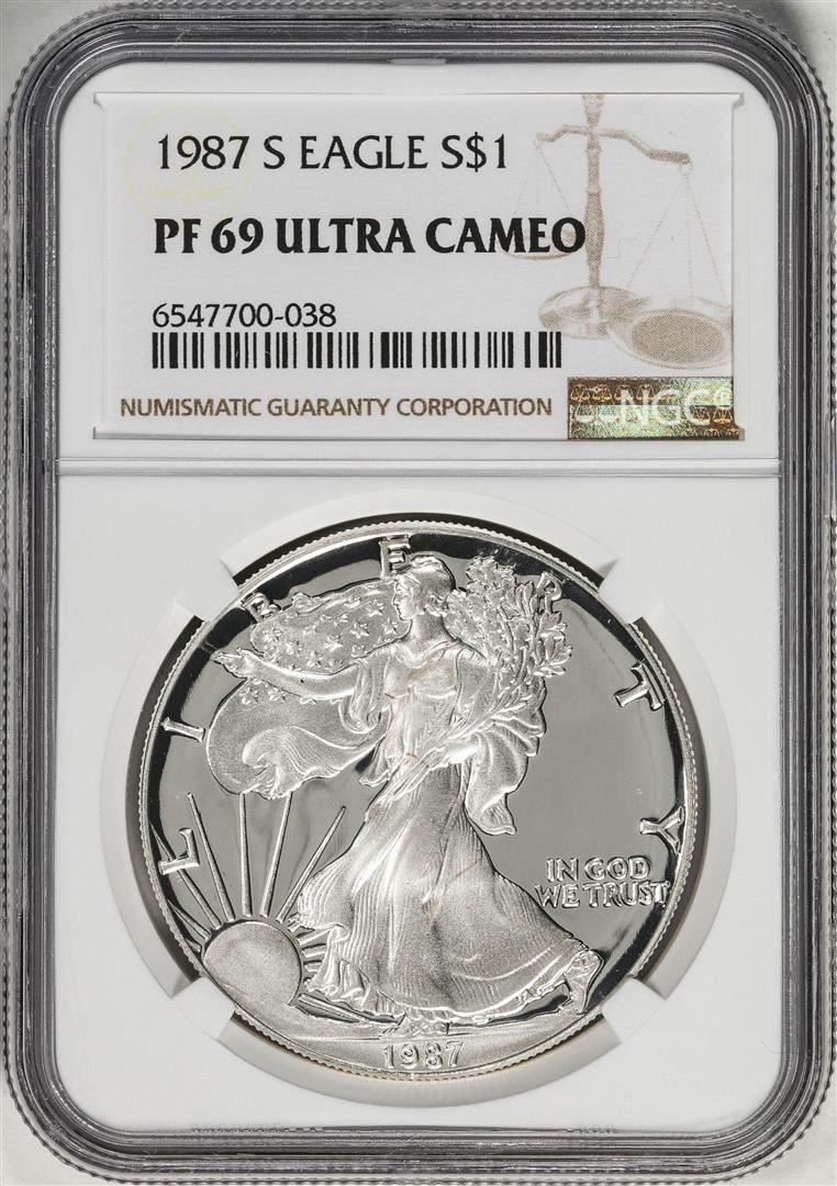 One 1987-S $1 Proof American Silver Eagle Coin NGC PF69 Ultra Cameo. NGC Certified.