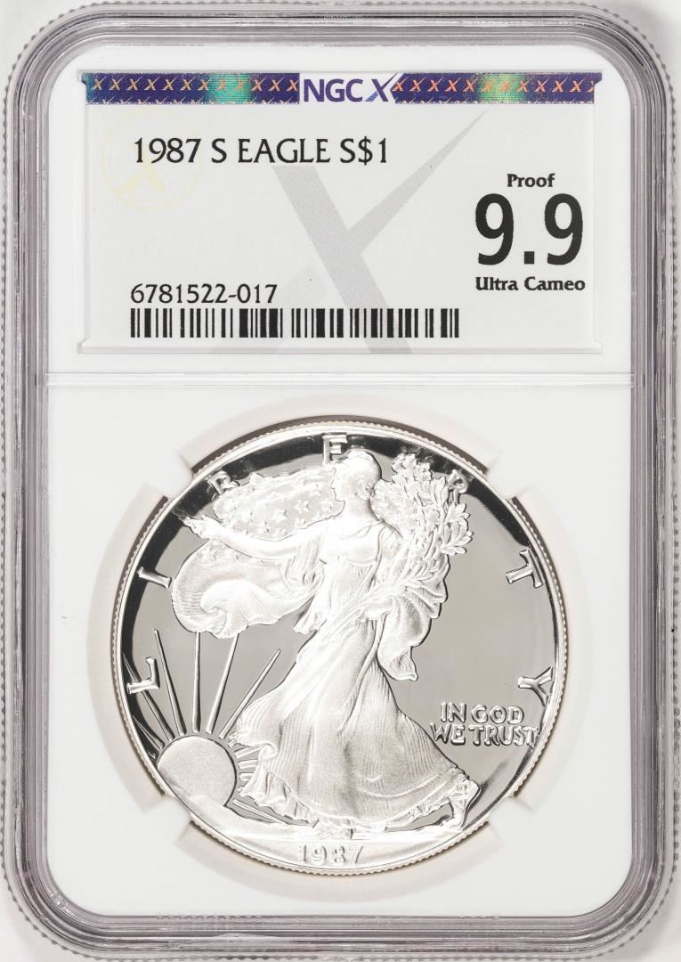 One 1987-S $1 Proof American Silver Eagle Coin NGCX Proof 9.9 Ultra Cameo. NGCX Certified.