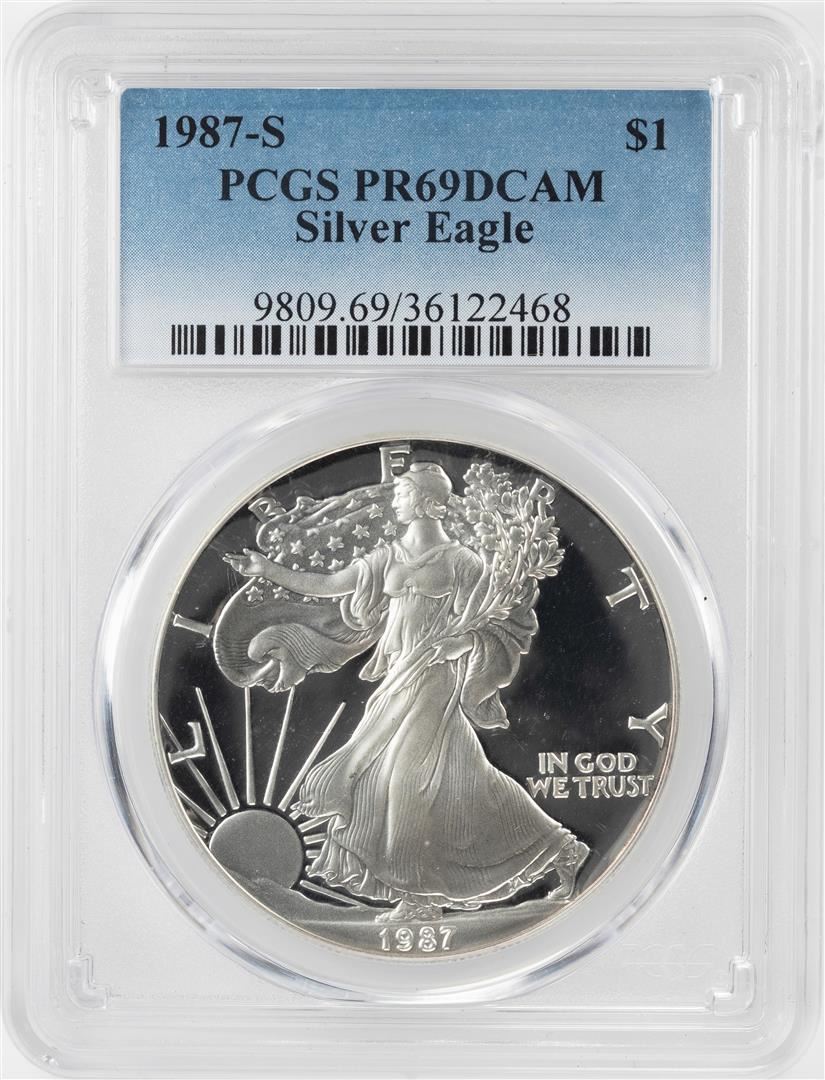 One 1987-S $1 Proof American Silver Eagle Coin PCGS PR69DCAM. PCGS Graded.