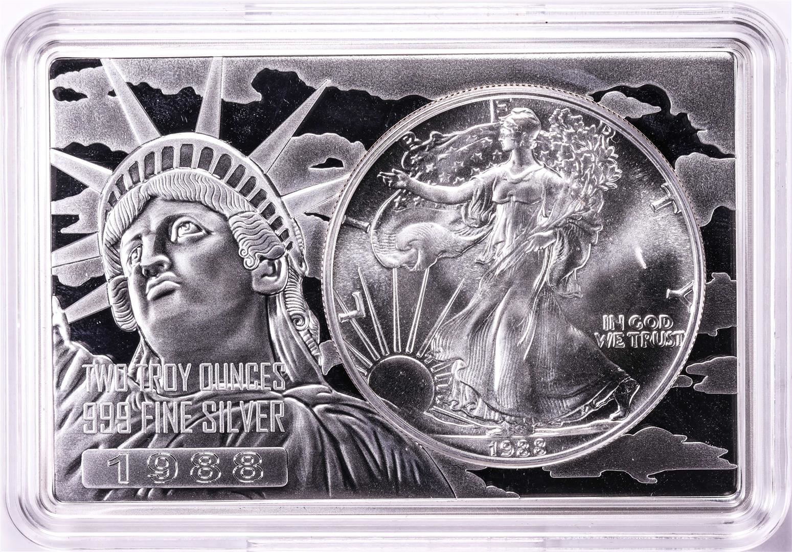 One 1988 $1 American Silver Eagle Coin & 2oz Silver Bar Set.