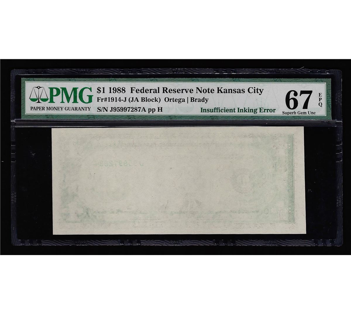 One 1988 $1 Federal Reserve Note ERROR Insufficient Inking PMG Gem 67EPQ. PMG Certified.